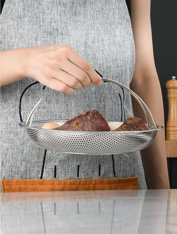 【Handvatontwerp, comfortabele grip】Deze Alles-in-één roestvrijstalen stomer met handvat heeft een handvat, zodat je je geen zorgen hoeft te maken dat je het gekookte eten niet kunt oppakken.