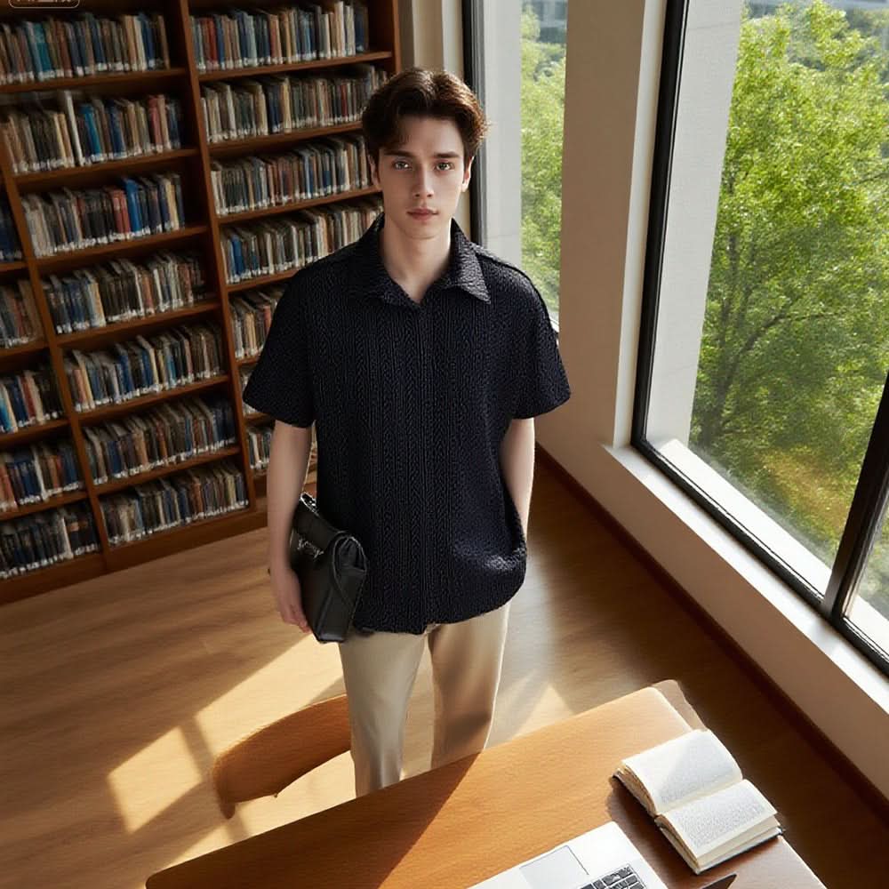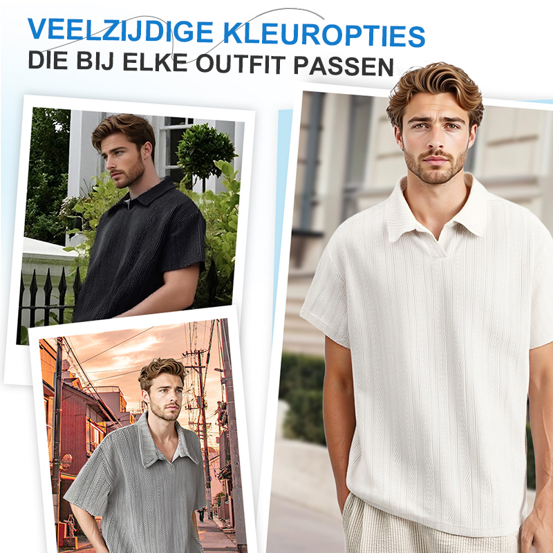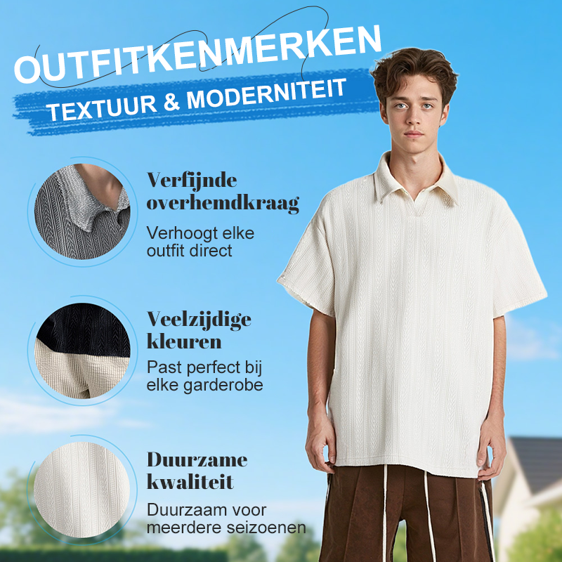 STIJLVOLLE TEXTUURSTOF VOOR EEN MODERNE UITSTRALING: Het korte mouwen overhemd met kraag is vervaardigd van een premium zachte stof met een subtiel verticaal textuurpatroon. Deze unieke textuur voegt diepte en visuele interesse toe aan het overhemd, waardoor het een verfijnde uitstraling krijgt die zich onderscheidt van eenvoudige ontwerpen.