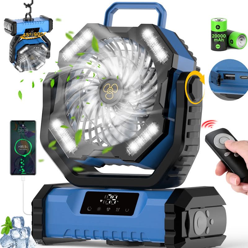 ULTRA LANGE BATTERIJLEVENSDUUR - Deze ventilator is uitgerust met een 20.000mAh batterij met hoge capaciteit, die zorgt voor een langere werktijd per keer opladen. Ideaal voor op de camping, bij stroomuitval of op reis.