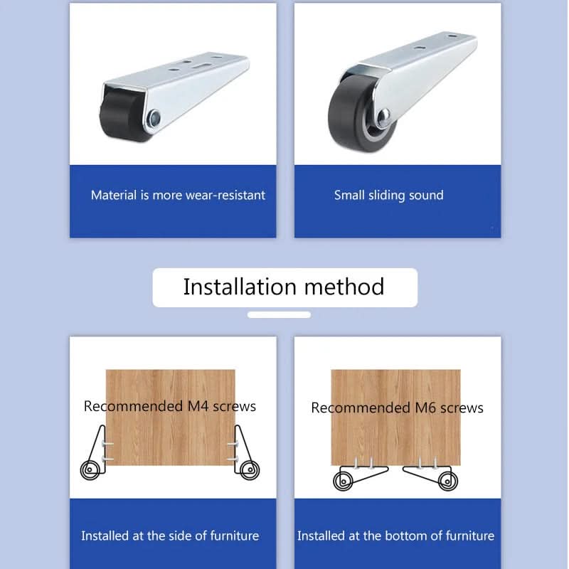 BREED TOEPASSINGSGEBIED: Deze zwenkwielen zijn geschikt voor verschillende soorten meubels, zoals telescopische tafels, slaapbanken en algemene meubelreparaties, en bieden veelzijdigheid en bewegingsgemak waar ze ook worden geïnstalleerd.