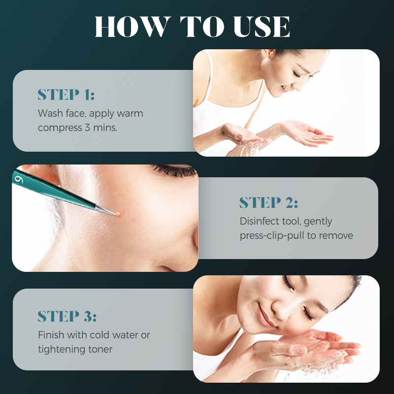 DRIE TIPS VOOR EEN GERICHTE BEHANDELING: Inclusief rechte, gebogen en schuine tips om mee-eters nauwkeurig aan te pakken. De rechte tip is voor kleine plekjes, de gebogen tip richt zich op mee-eters in de neus en de schuine tip is geschikt voor grotere gebieden zoals voorhoofd en kin.