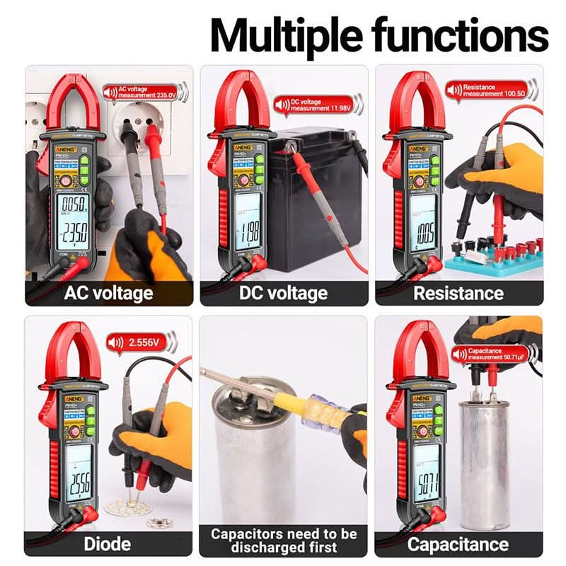 Het instrument meet ac en dc spanning, stroom, weerstand, akoestische pass-test, diode, temperatuur, contactloze ac spanningsmeting (NCV) en condensator en frequentie (Hz).Het is een automatische digitale multimeter (DMM) met ac-stroomtang meetfunctie.