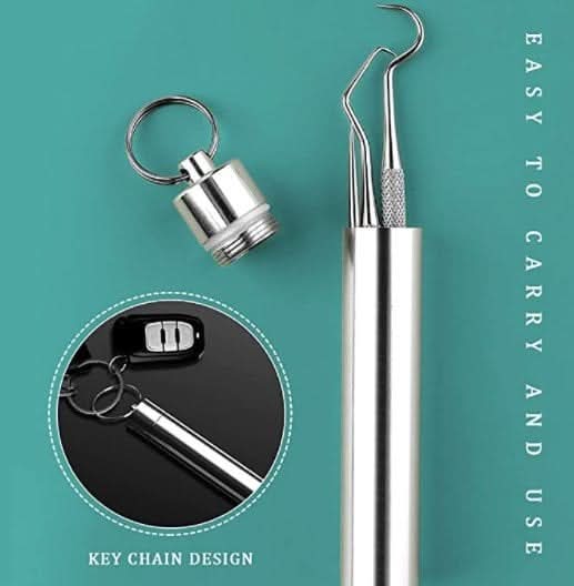 Denna rostfria tandpetare fungerar ocksĂ„ som fruktpetare, eller hjĂ€lper dig att öppna telefonens SIM-kortfack! Praktiskt verktyg för camping, vandring, picknick, cykling, resor och dagligt bruk – en verktyg, flera anvĂ€ndningar!